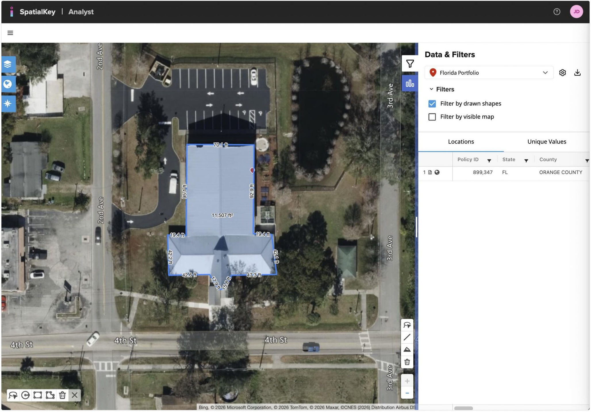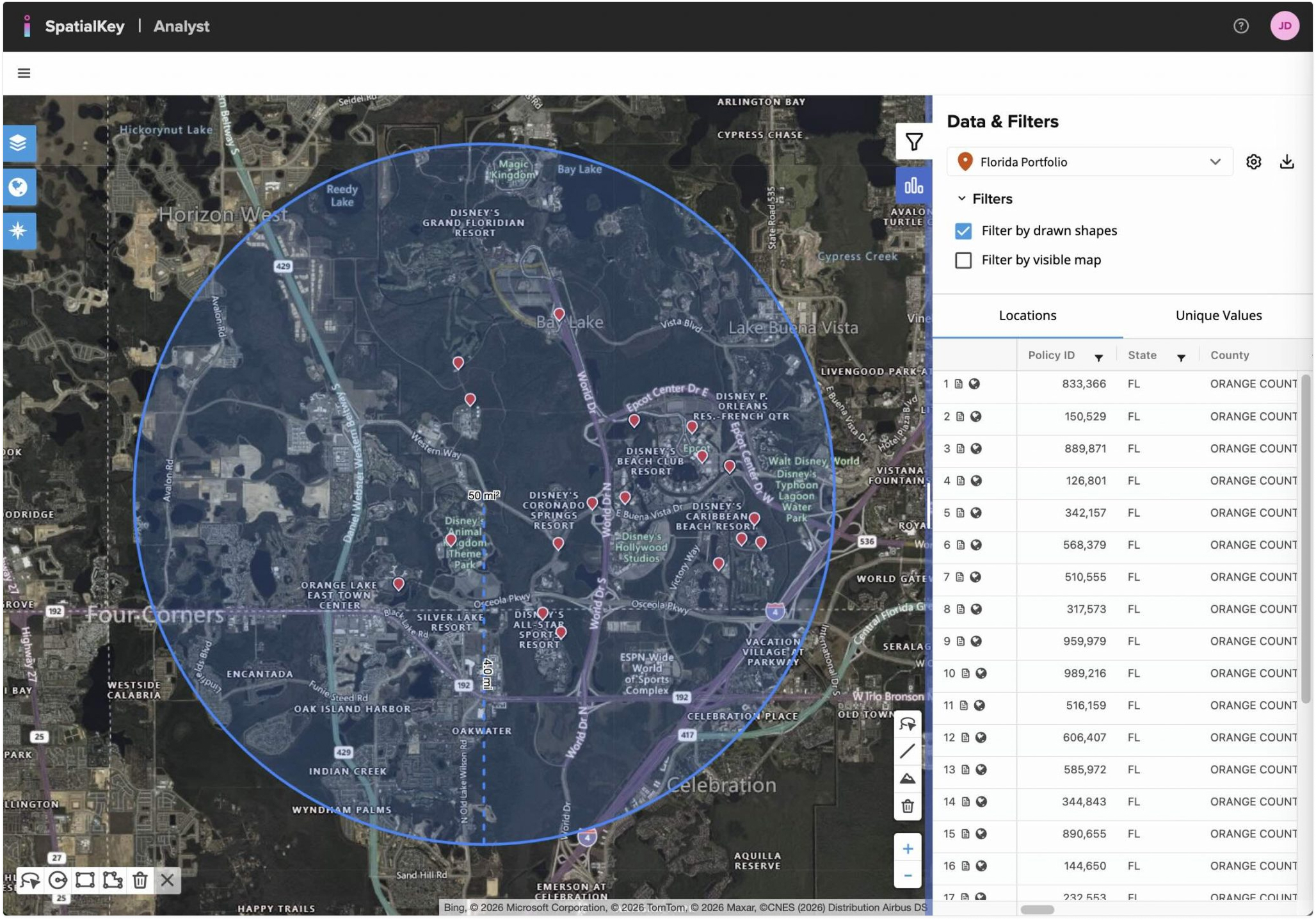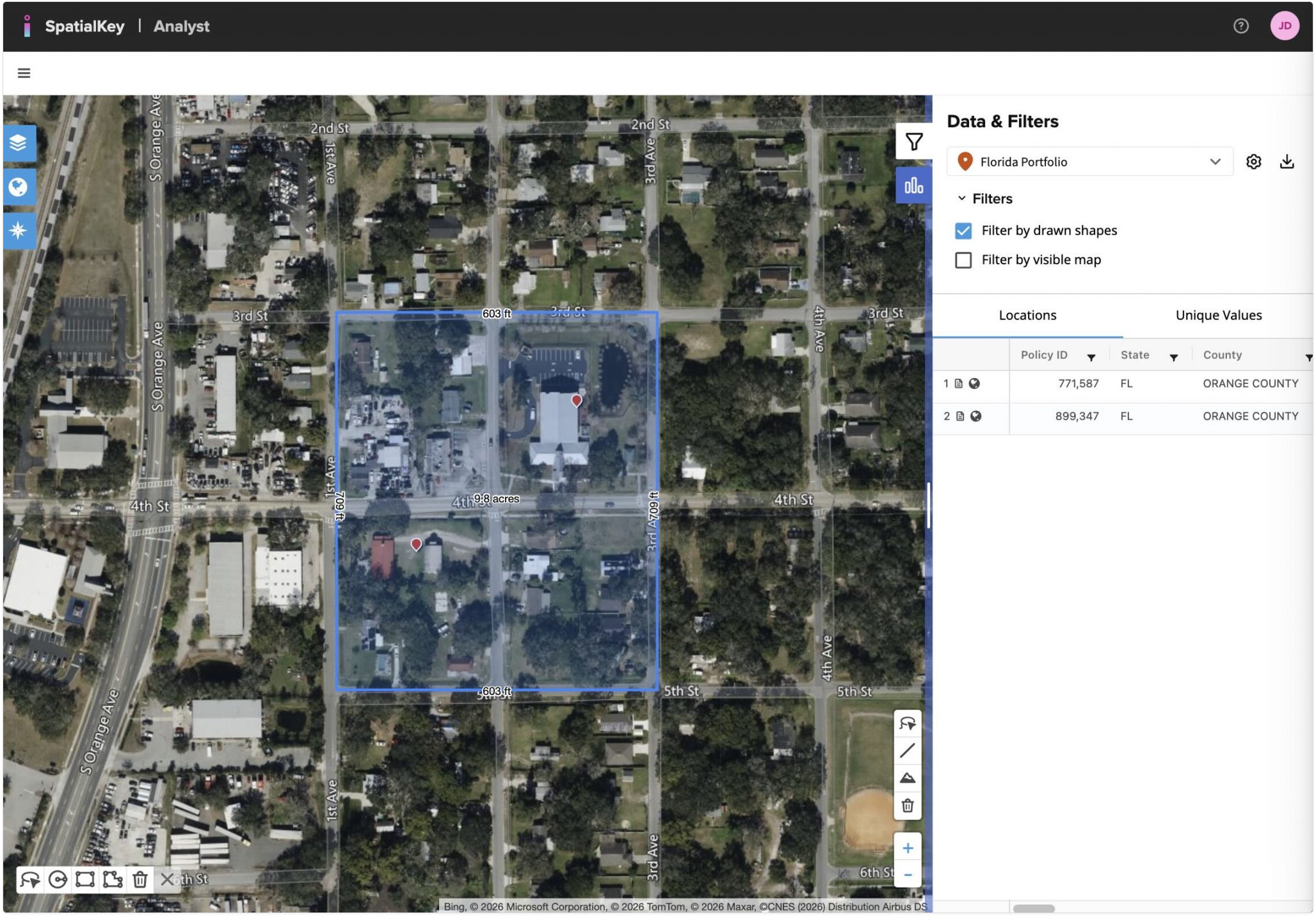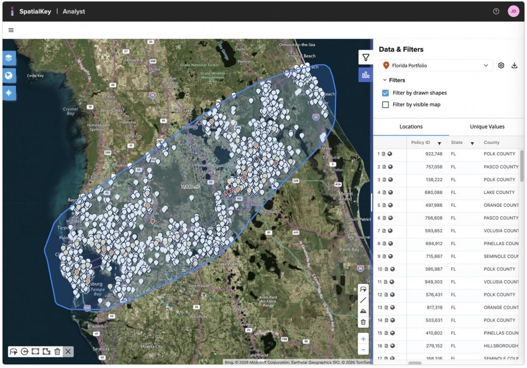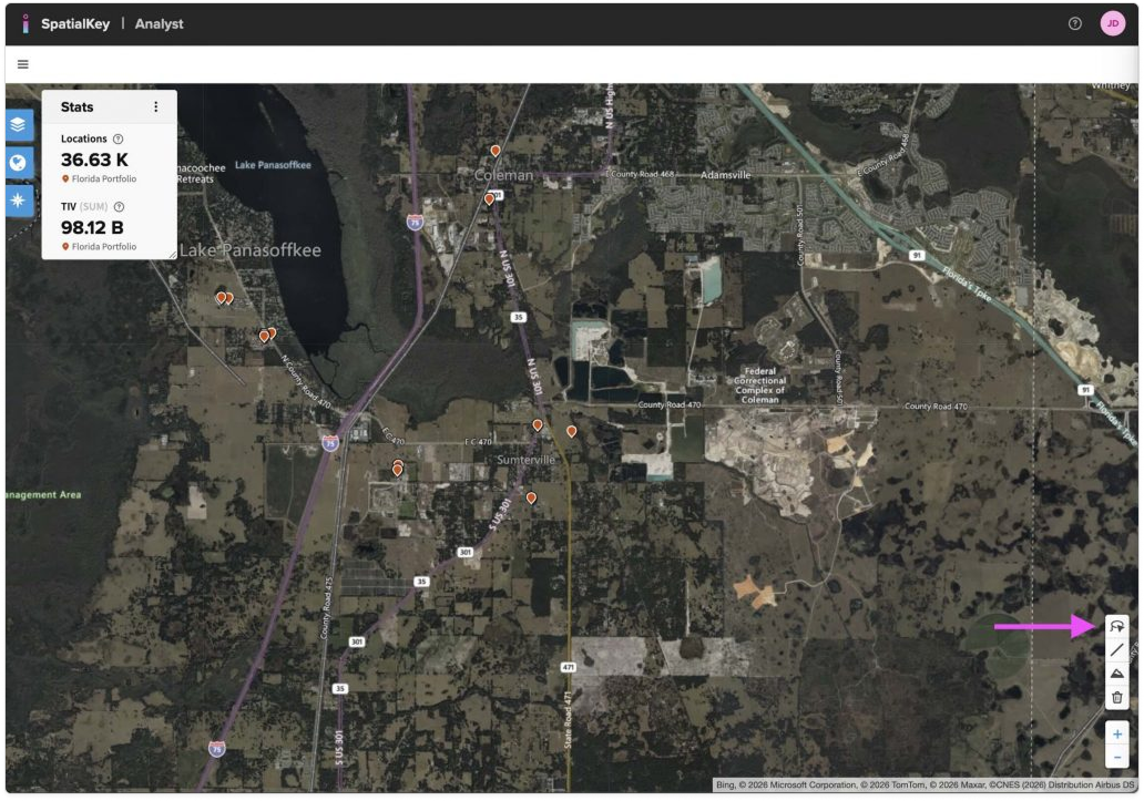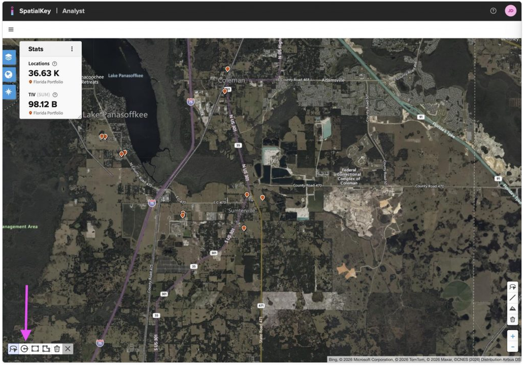 With the Circle tool, you draw a circle from the center point outward. Press, hold, and drag to set the radius, then release to finish—the circle appears automatically. This tool is ideal for measuring accumulations within a specific radius or filtering around an address or latitude/longitude. See this article to learn more about centering on a specific address. The example below shows a radius highlighting an exposure accumulation