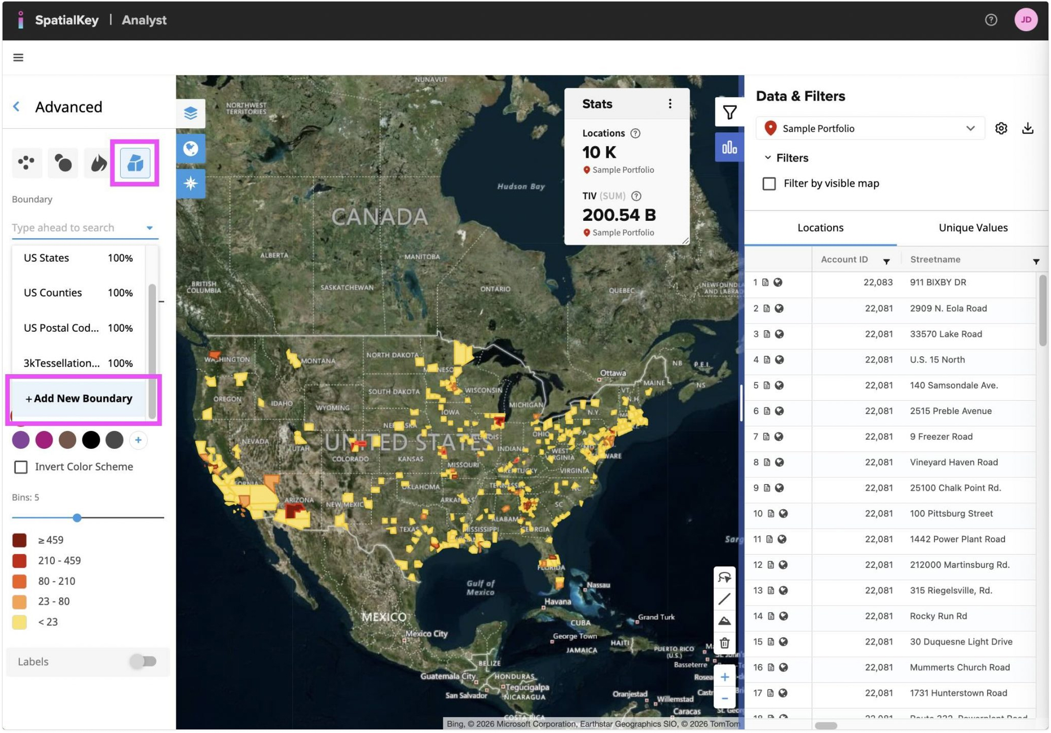You can join a dataset to a boundary file using matches between point locations in the dataset and boundary file. The join will allow you to view your dataset thematically within the shapes of the boundary file. This allows you to visualize the data within the shapes of the boundary file – for example, to show the total amount of sales in each sales territory or the insured value of properties within a storm footprint.