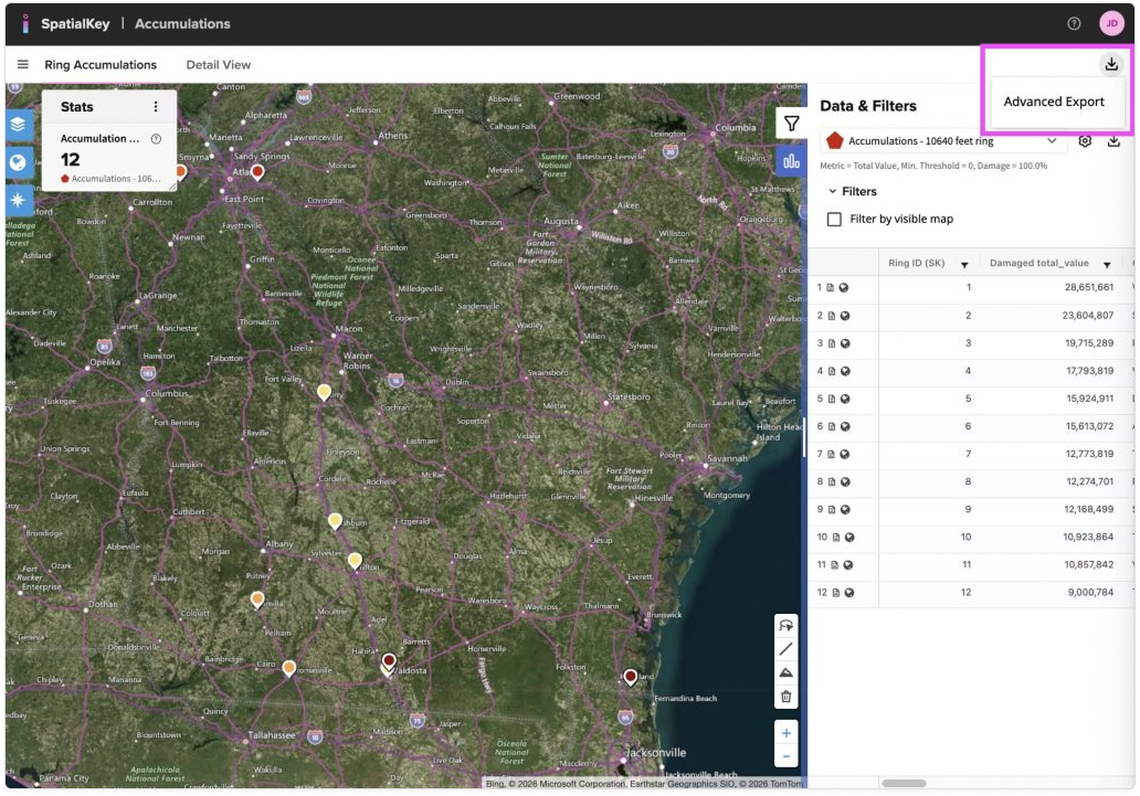 Image of the SpatialKey Accumulations interface showing a map with ring accumulation markers and a statistics panel on the left. On the right, the Data & Filters panel is open, with an Advanced Export option highlighted at the top, above a table listing ring IDs and associated damaged total values, indicating export options for accumulation data.