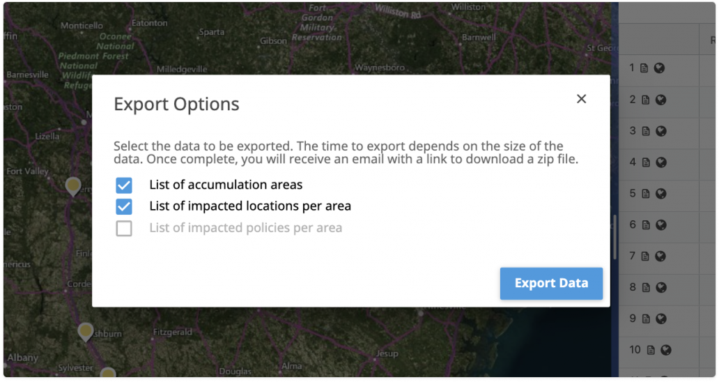 Image of an Export Options modal dialog displayed over a map interface. The dialog includes checkboxes for exporting a list of accumulation areas and a list of impacted locations per area, with an inactive option for impacted policies. An Export Data button appears in the lower-right corner, indicating the action to download selected data.