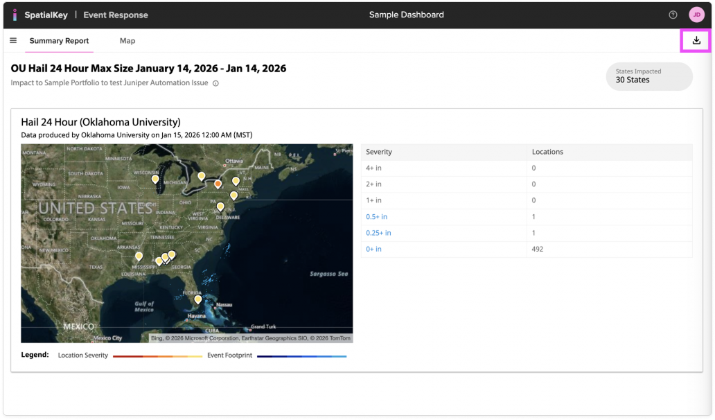 Image of the SpatialKey Event Response dashboard showing a summary report for a U.S. hail event with a map of affected locations and a severity table. In the top-right corner, a highlighted download icon indicates the option to export or download the event report data.