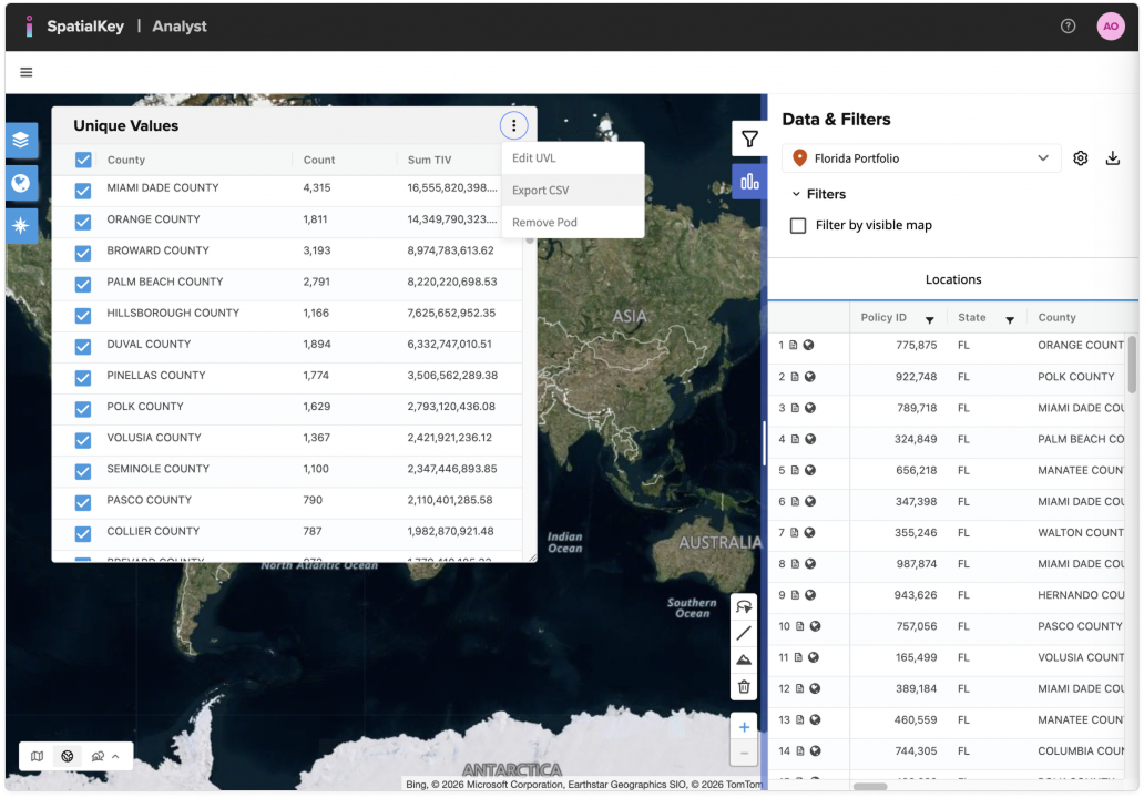 Image of the SpatialKey Analyst interface with a contextual menu open on a “Unique Values” table. The menu displays options including “Edit UVL,” “Export CSV,” and “Remove Prod,” indicating data export functionality for a selected unique value list.