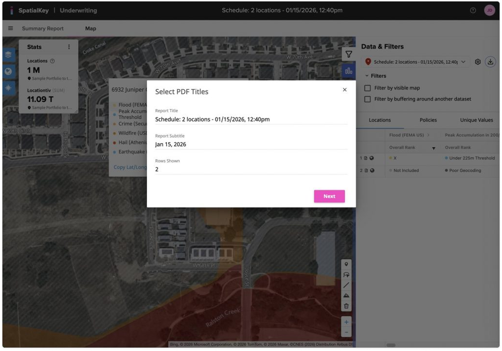 Image of the SpatialKey Underwriting map view with a modal window titled “Select PDF Titles” open in the center of the screen. The dialog displays editable report title and subtitle fields, a field showing the number of rows included, and a Next button, indicating a step in the customized PDF export process.