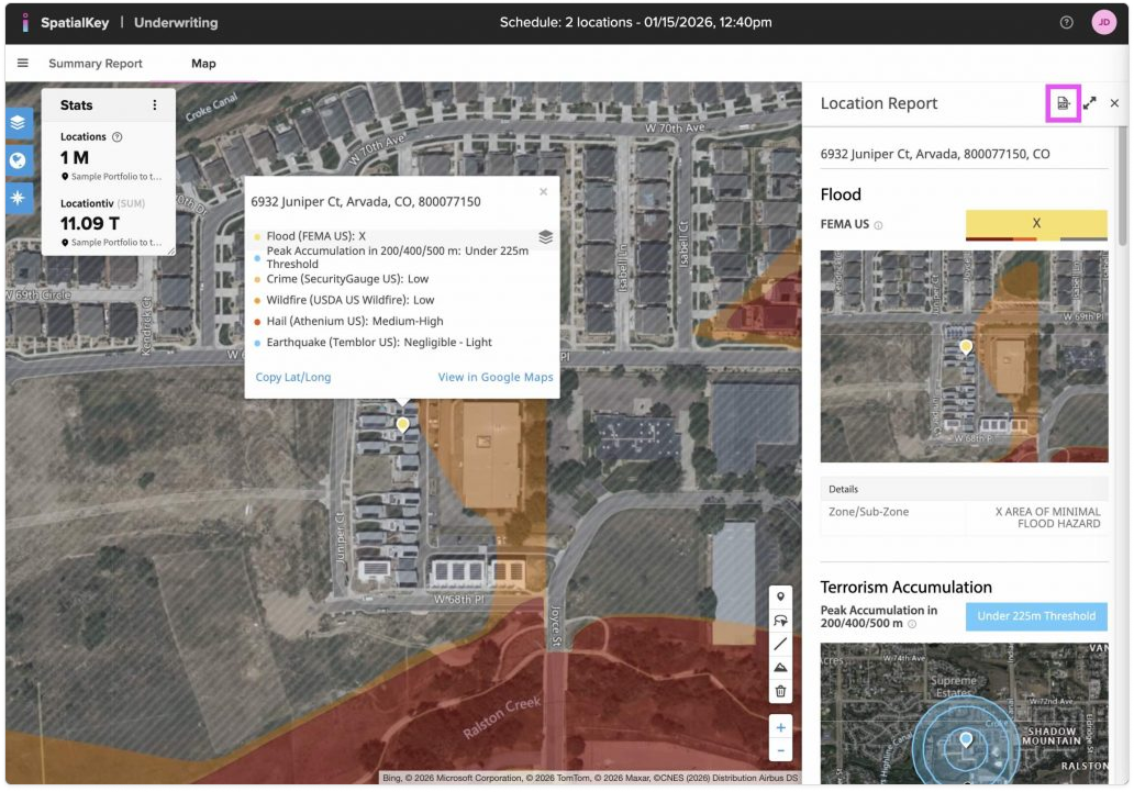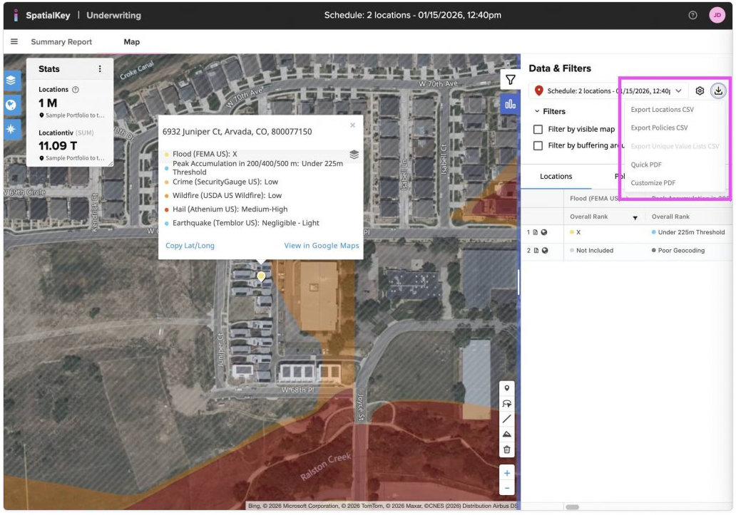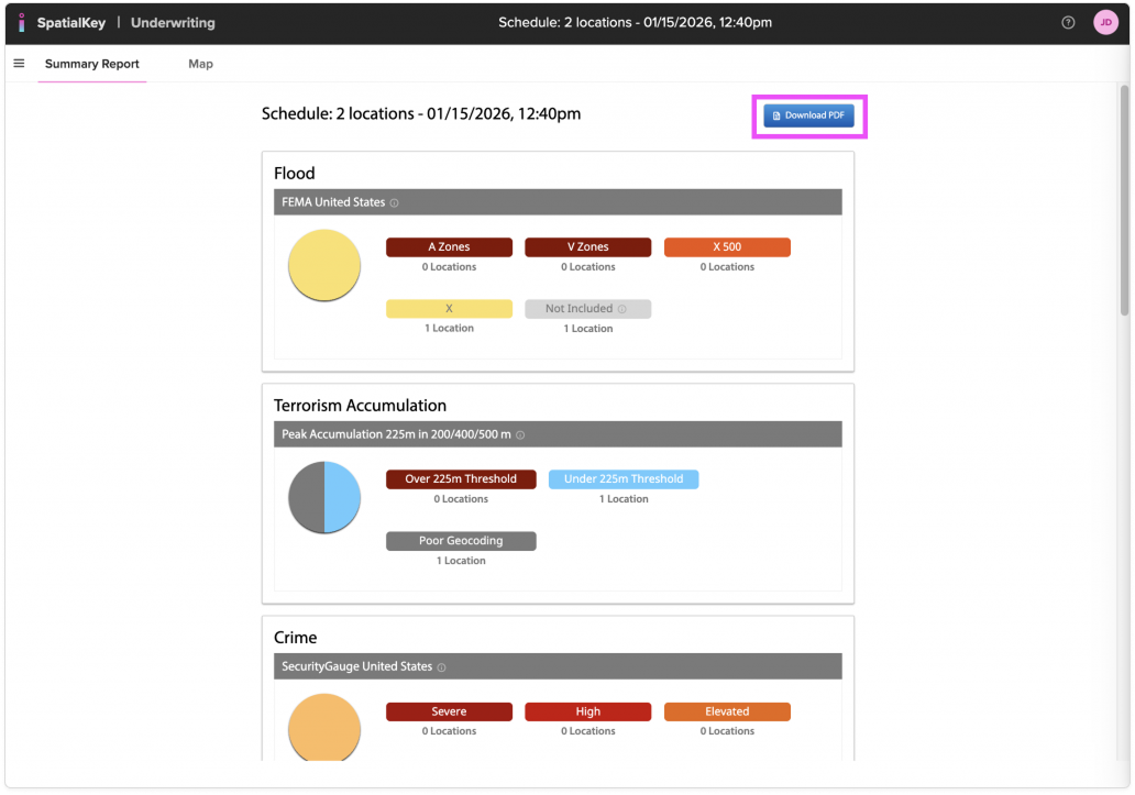 The Underwriting app additionally allows you to download the report views as a PDF. You can download the Summary Report, List Report and each individual Location Report.
