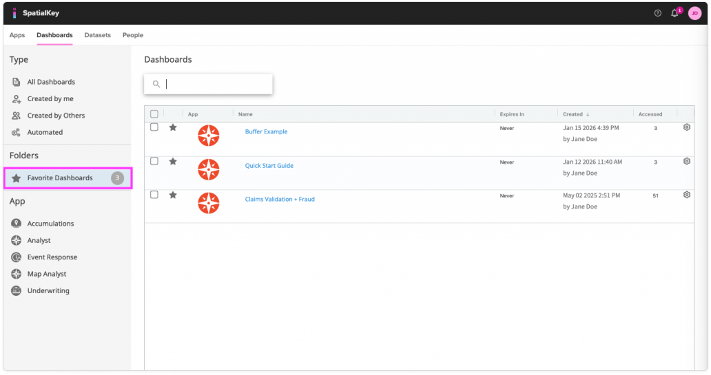 You can also quickly filter your list of dashboards by favorites by clicking Favorite Dashboards in the left navigation.