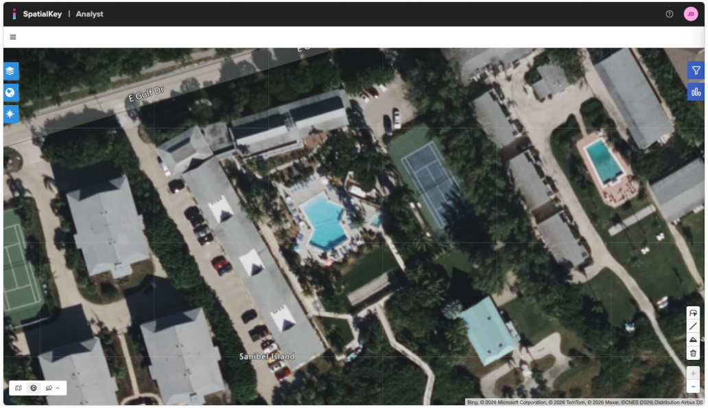SpatialKey provides access to premium high‑resolution aerial imagery from Vexcel, enabling analysts to view precise, near‑ground‑level detail for property and location assessments. This feature is designed to support underwriting, claims, and catastrophe response workflows where clarity and accuracy are critical.