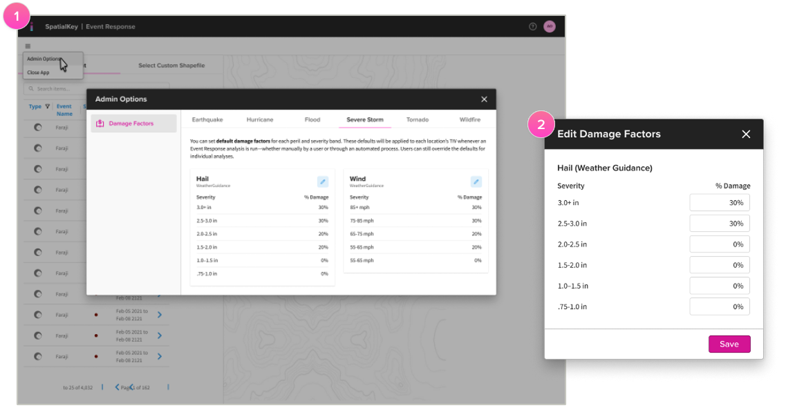 - By default, impacted locations are assumed to be damaged at 100% when estimating exposure. This is intentionally conservative and meant to be replaced with more realistic peril‑based values. Admins can customize these default damage factors, and those values will be applied automatically to all subsequent analyses.