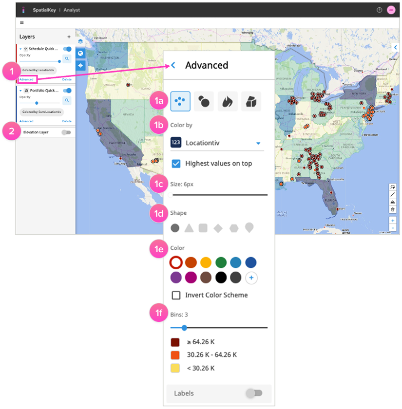 - B) Color By: Color your data by any column on your dataset e.g., TIV or City. When visualizing by graduated circles, heatmap, or thematic, only aggregate numeric values will apply.