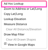 Right‑click context menu displayed on the map with the **“Ad Hoc Lookup”** option highlighted in pink at the top, indicating a tool that allows the user to perform a lookup action for the selected map location in addition to accessing other map tools and actions.