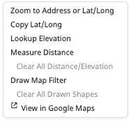 Right‑click context menu displayed on the map listing available actions, including **Zoom to Address or Lat/Long**, **Copy Lat/Long**, **Lookup Elevation**, **Measure Distance**, **Draw Map Filter**, **Clear All Drawn Shapes**, and **View in Google Maps**, showing the full set of map interaction tools available to the user.