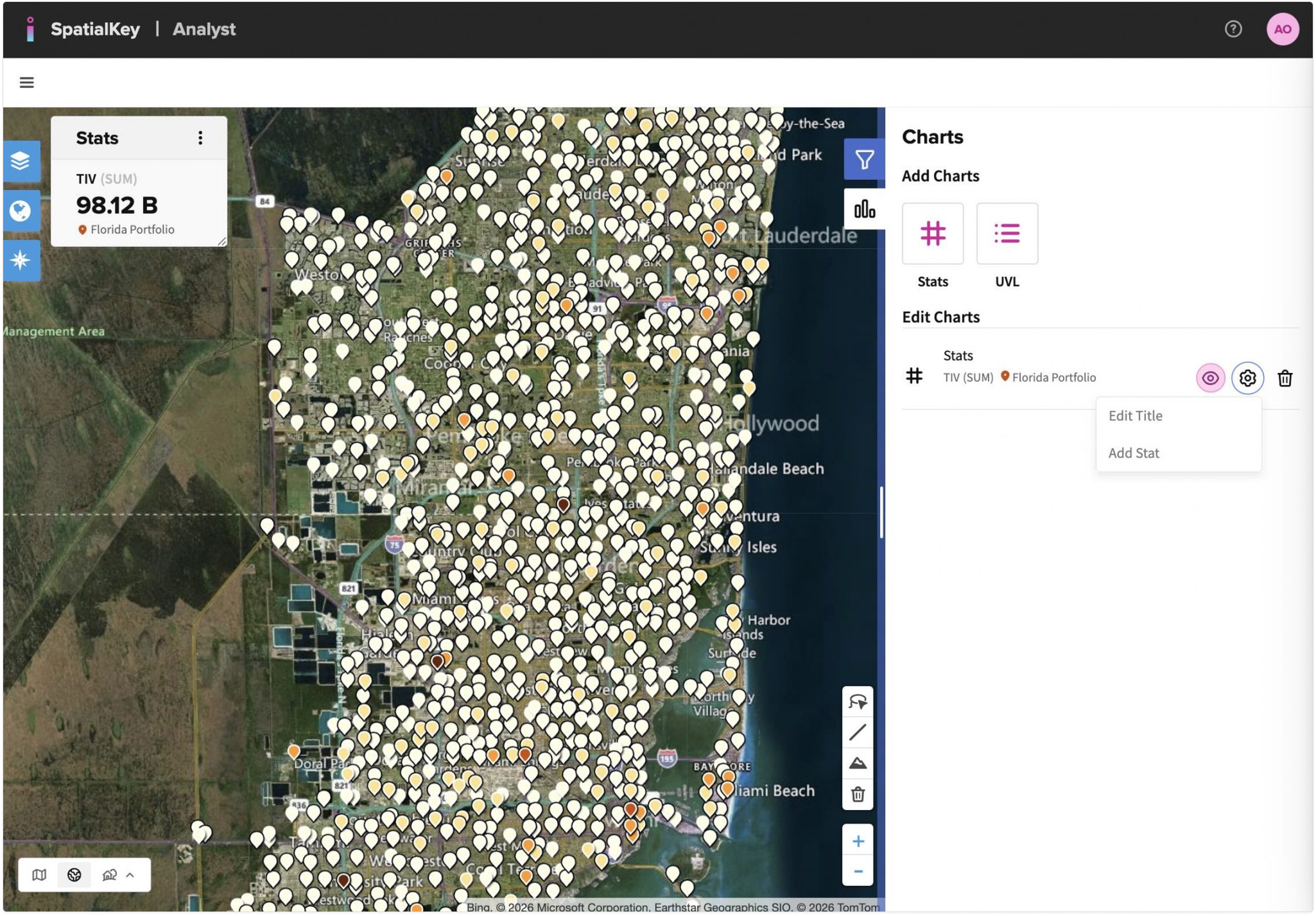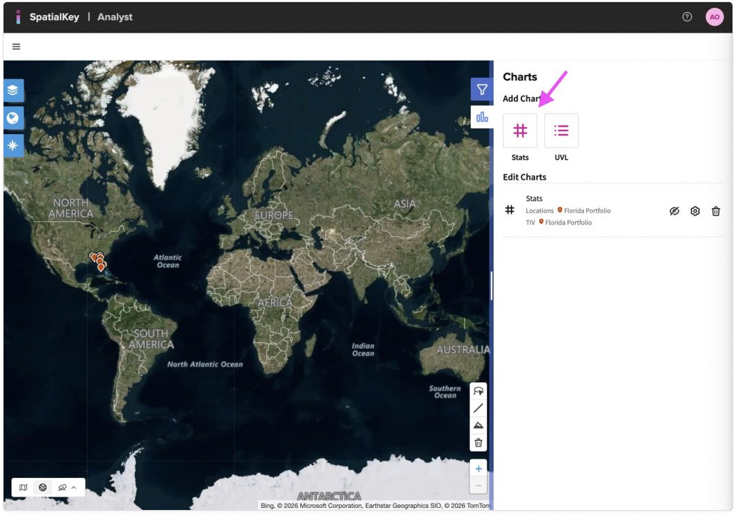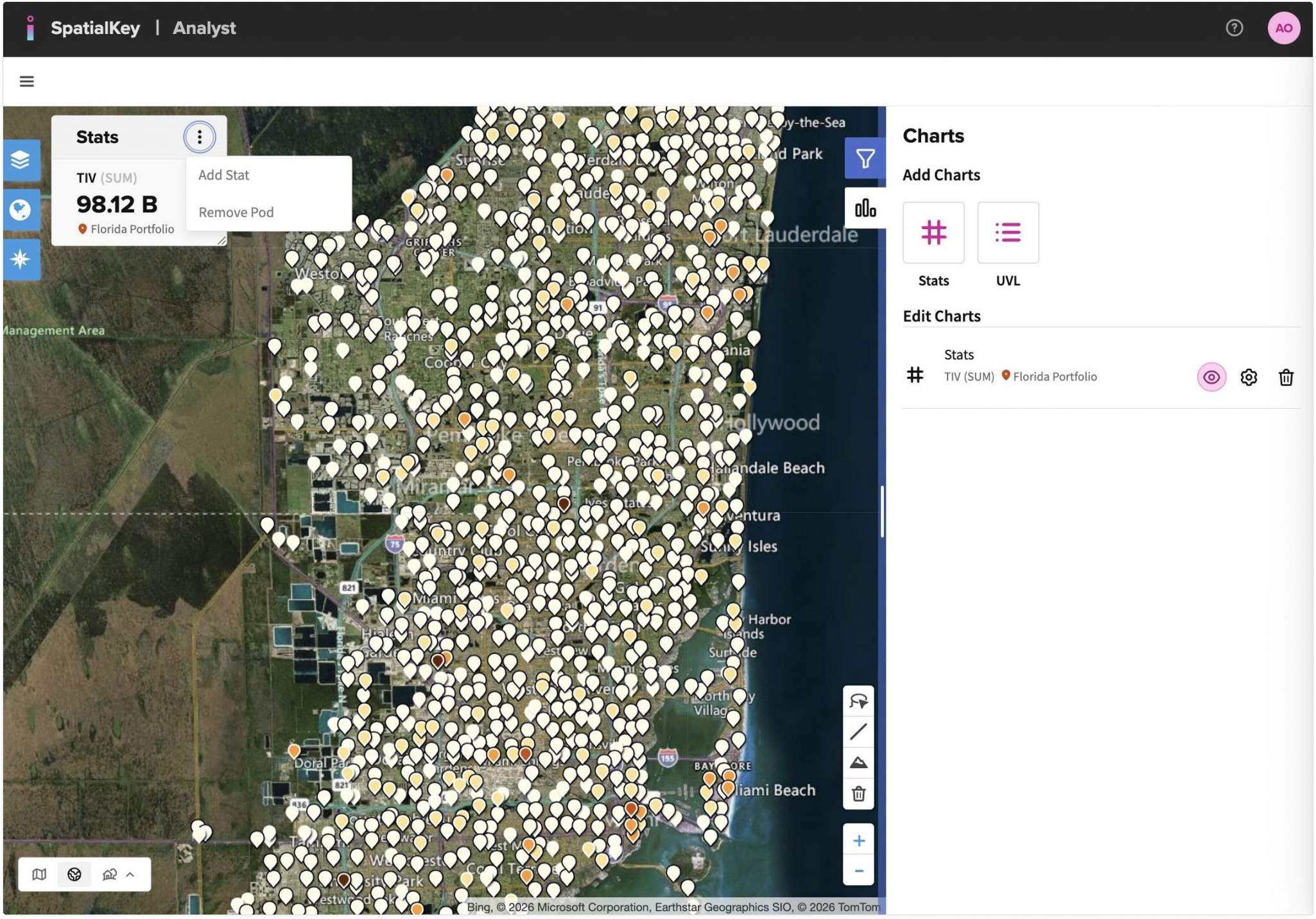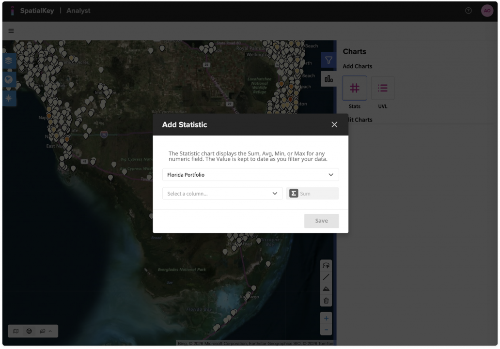 SpatialKey’s Stats pod provides a way to add custom summary statistics to your dashboard views. Add a Stats pod from the Charts panel on the right side of the map.