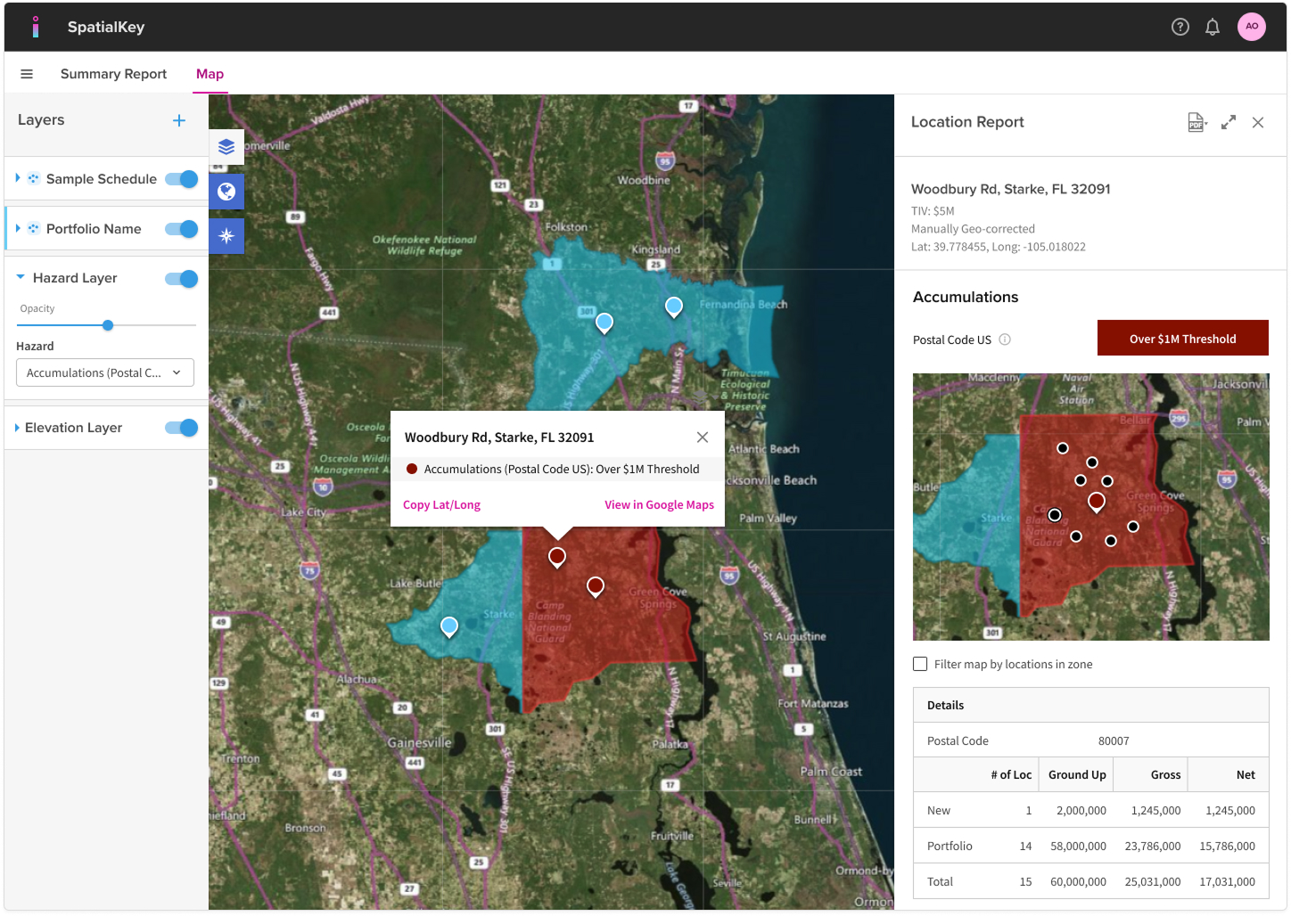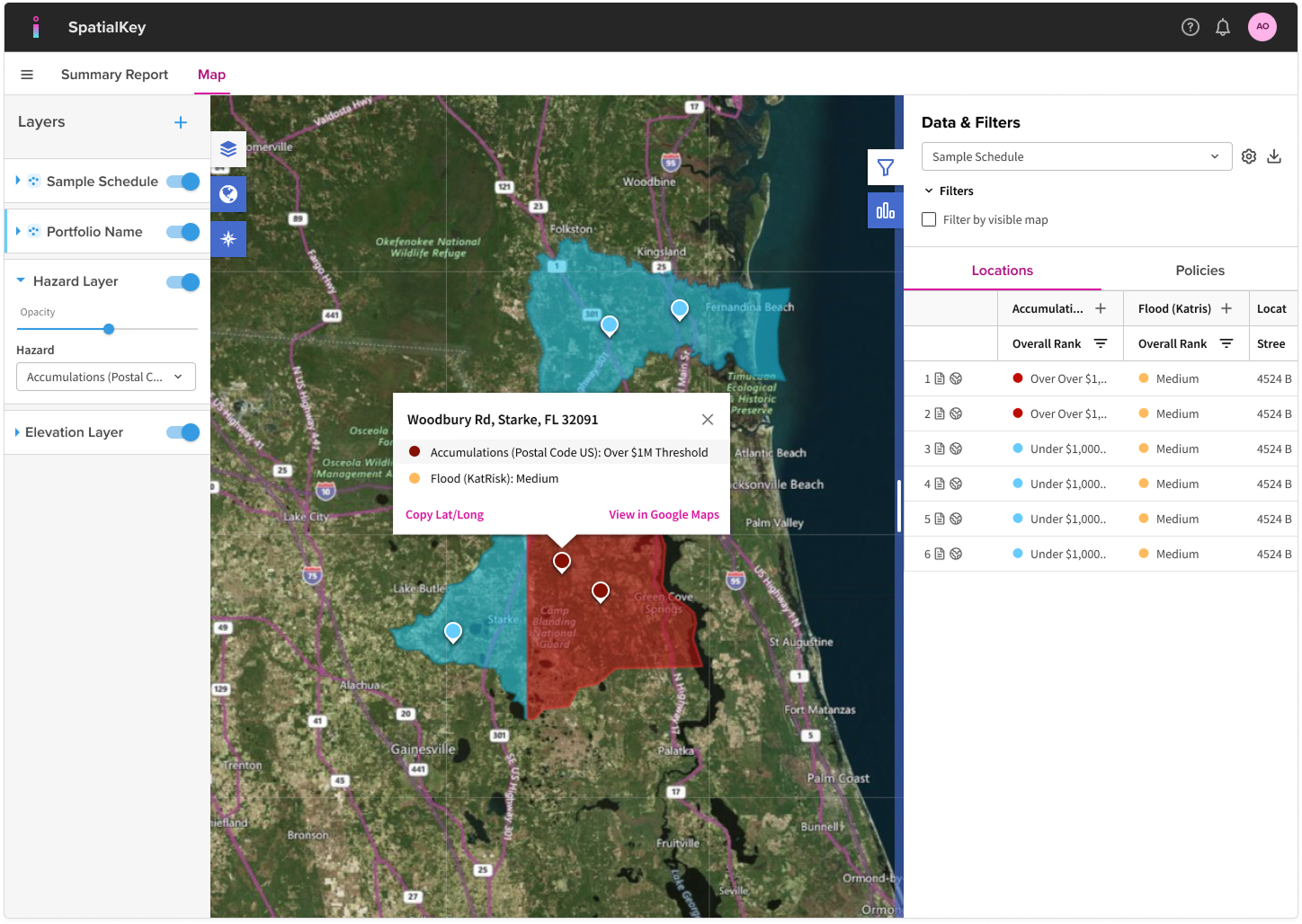 Click the report icon in each row or on the location point on the map to dive into each schedule location and see a zoomed in view of the zone along with your total exposure.