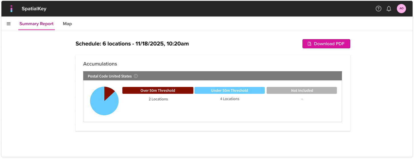 If you ran more than 1 location in your analysis, you’ll initially see a summary of your schedule based on whether the new locations fell within existing concentrations (from your portfolio in-force) that go over the threshold set for your organization. This view provides a high-level look at where to focus your analysis.