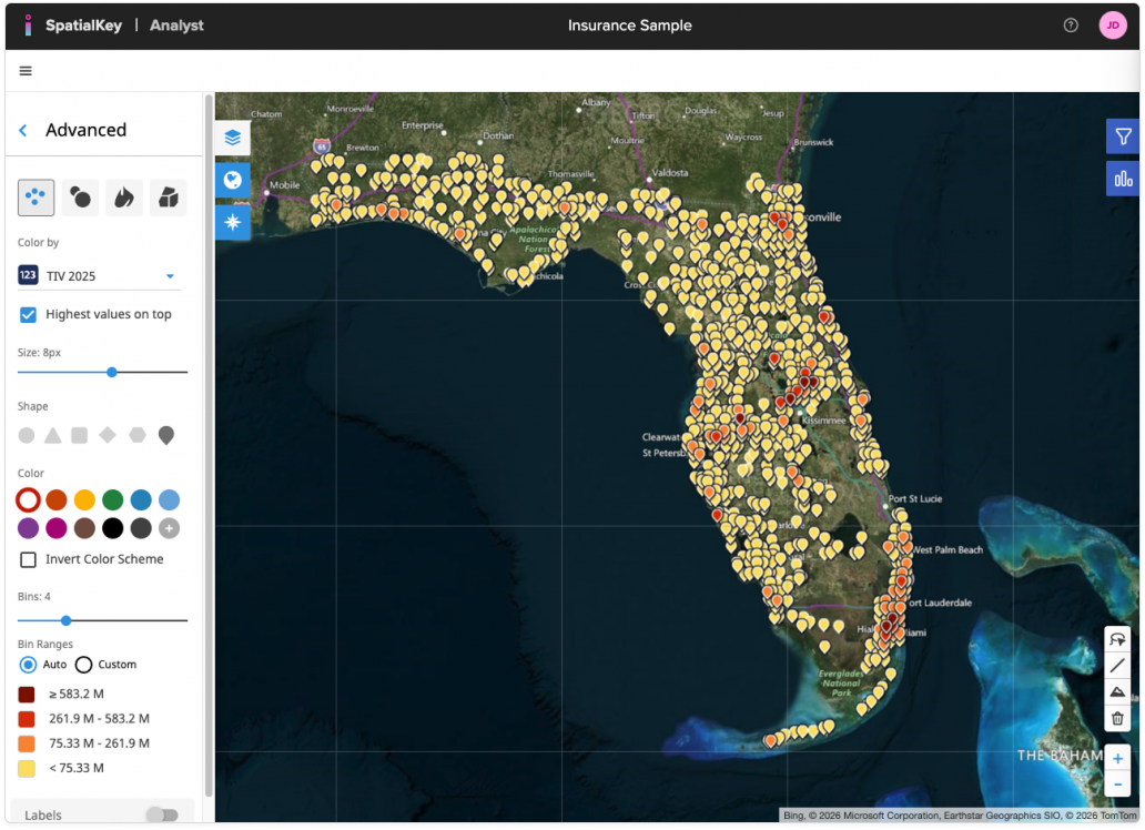 An image of the SpatialKey Analyst Advanced styling panel for point visualization. The panel shows Color by: TIV 2025 (numeric), with “Highest values on top” enabled, a size slider set to 8px, and shape options displayed. A color palette is shown below, followed by Bins: 4 and Bin Ranges set to Auto, with four automatically generated value ranges listed from highest to lowest (≥ 583.2 M down to < 75.33 M), each represented by a different color.